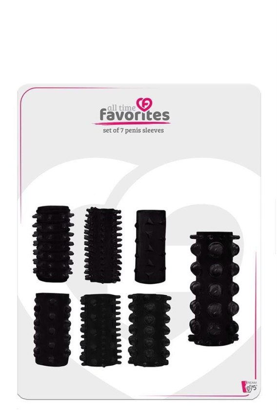 Ten zestaw 7 rękawów na penisa z etykiety All Time Favorites ma 7 różnych tekstur. Są rozciągliwe i dzięki dopasowanemu dopasowaniu działają jak pierścień na penisa dla twardszych i dłuższych erekcji, a konsystencja pobudza ją podczas stosunku.