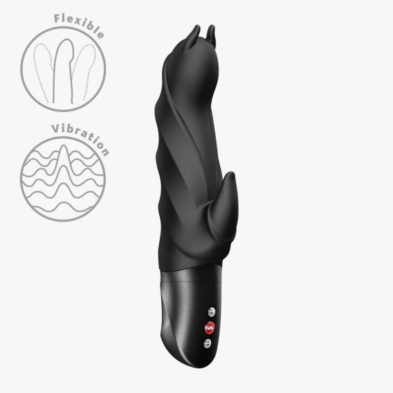 Zakrwiony trzon z miękkiego silikonu oraz zmysłowa, falista faktura celują w punkt G, podczas gdy precyzyjny stymulator łechtaczki wysyła pobudzające impulsy.