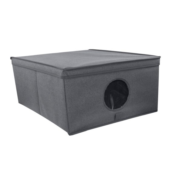 Pudełko jest wykonane ze sztywnej tkaniny w kolorze szarym, neutralnym i eleganckim odcieniu, który pasuje do każdego stylu wnętrza. Pudełko ma prostokątny kształt o wymiarach 48x36x19 cm i przezroczyste okienko z przodu, które pozwala zobaczyć zawartość bez konieczności otwierania. Pudełko nie ma uchwytów, aby zachować czystą i minimalistyczną linię.
