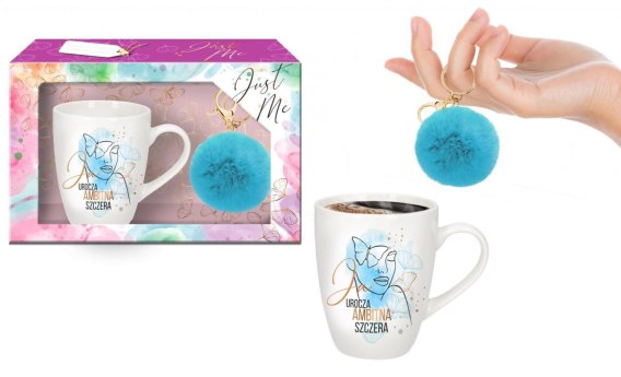 JUST ME - zestaw kubek baryłka 300ml+pompon niebieski-Ja urocza, ambitna, szczera