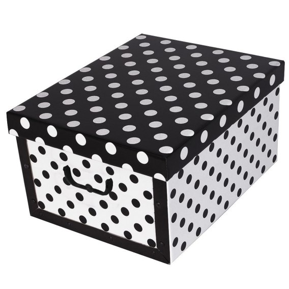 Pudełko kartonowe MAXI w białe kropki na czarnym tle to eleganckie rozwiązanie do przechowywania, które łączy klasyczny design z nowoczesną funkcjonalnością. Wykonane z kartonu w 100% z recyklingu, stanowi połączenie estetyki i dbałości o środowisko.