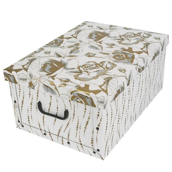 Pudełko kartonowe MAXI "Złote róże" to eleganckie i praktyczne rozwiązanie do organizacji przestrzeni w domu, biurze czy garderobie. Wykonane z kartonu w 100% z recyklingu, łączy stylowy design z troską o środowisko. Wzór złotych róż nadaje wnętrzu luksusowego, a zarazem subtelnego charakteru.