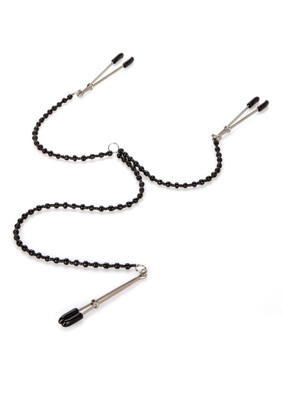 Unikalne połączone ze sobą klipsy na sutki i łechtaczkę z regulacją pierścienia napinającego.