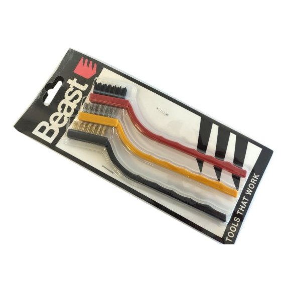 Zestaw 3 mini szczotek wykonanych ze stali nierdzewnej, mosiądzu i nylonu.